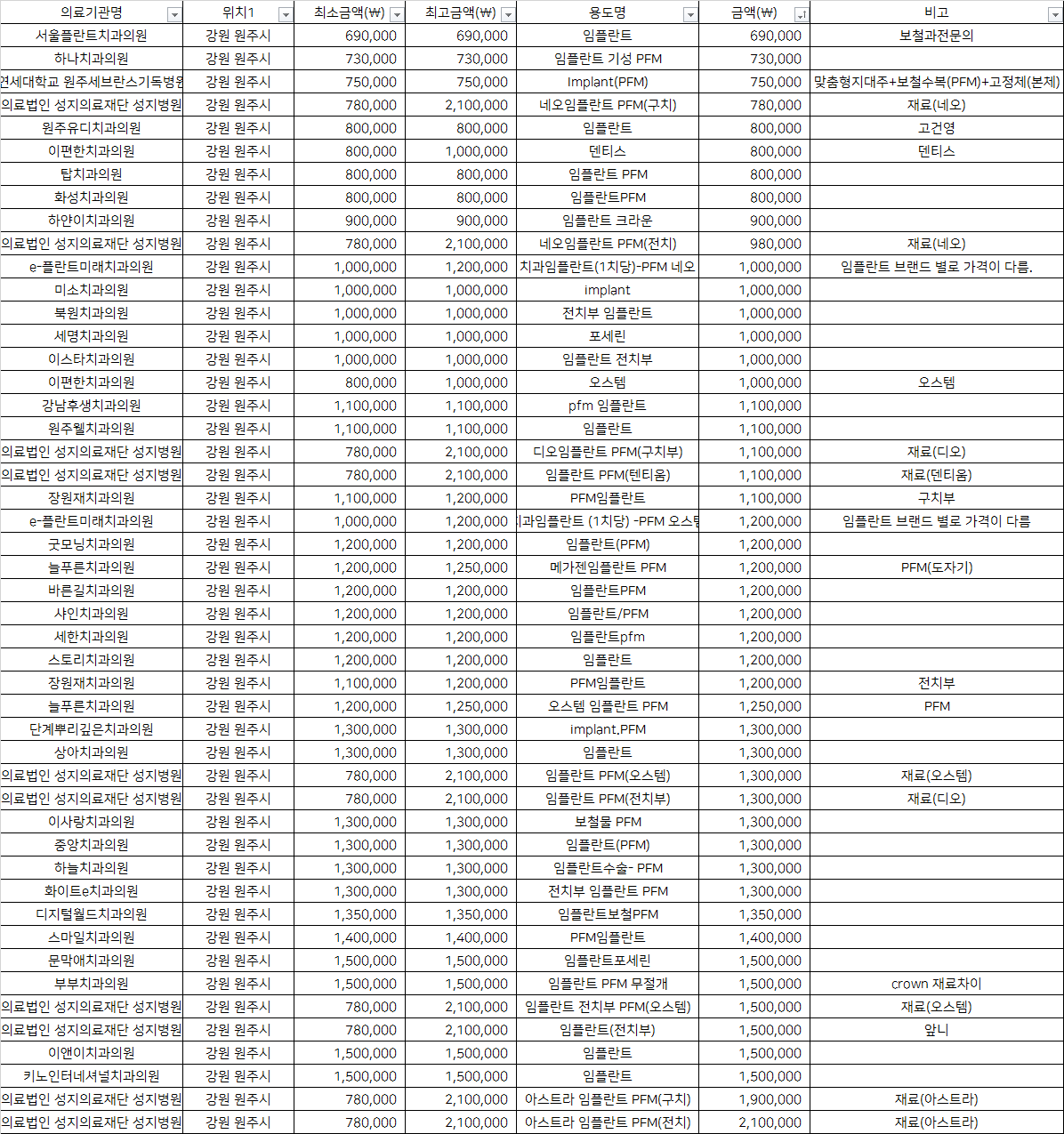 | 원주웰치과의원 | 임플란트 | 1,100,000 | |