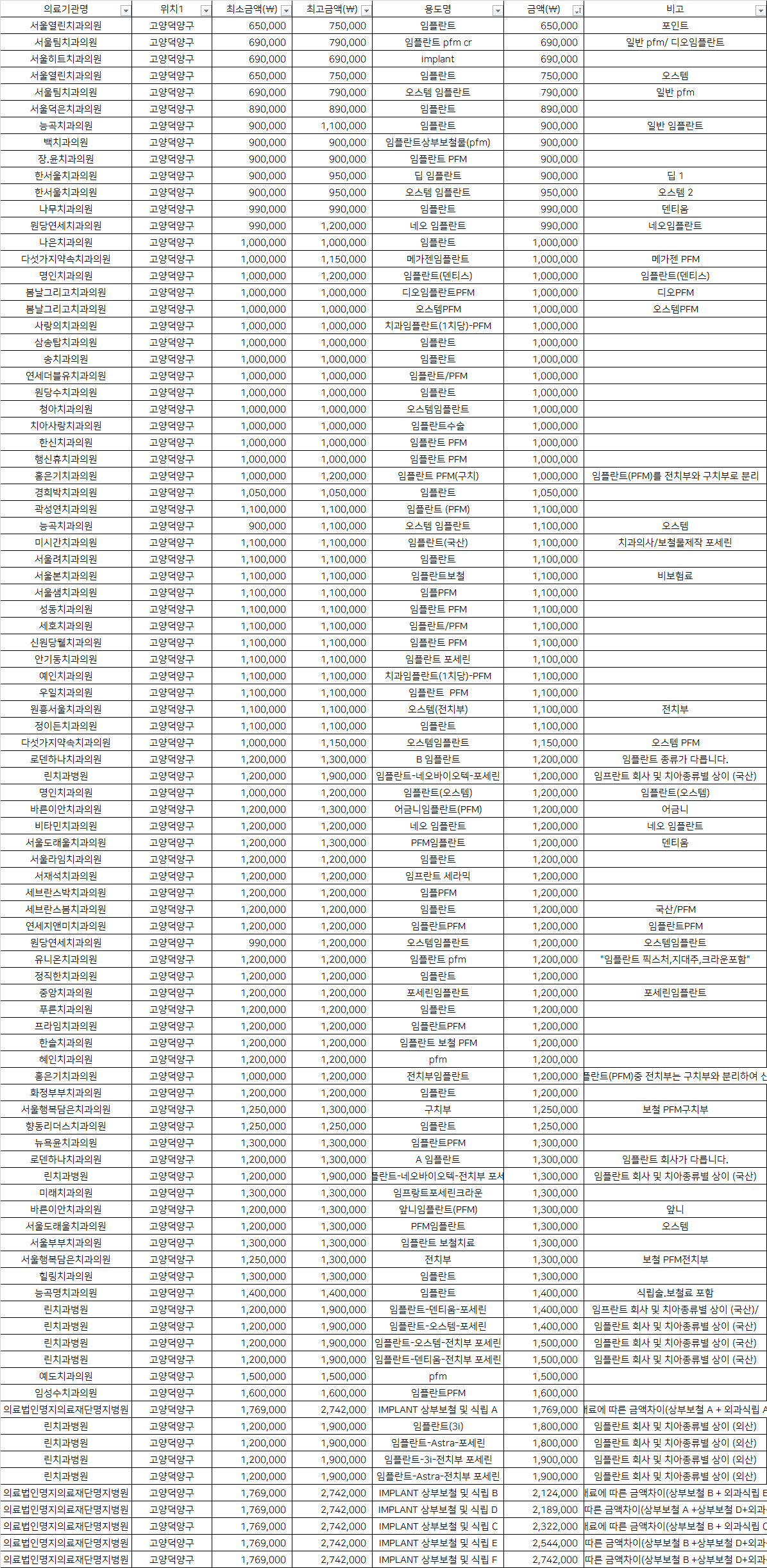 | 의료법인명지의료재단명지병원 | IMPLANT 상부보철 및 식립 C | 2,322,000 | 재료에 따른 금액차이(상부보철 B + 외과식립 C) |