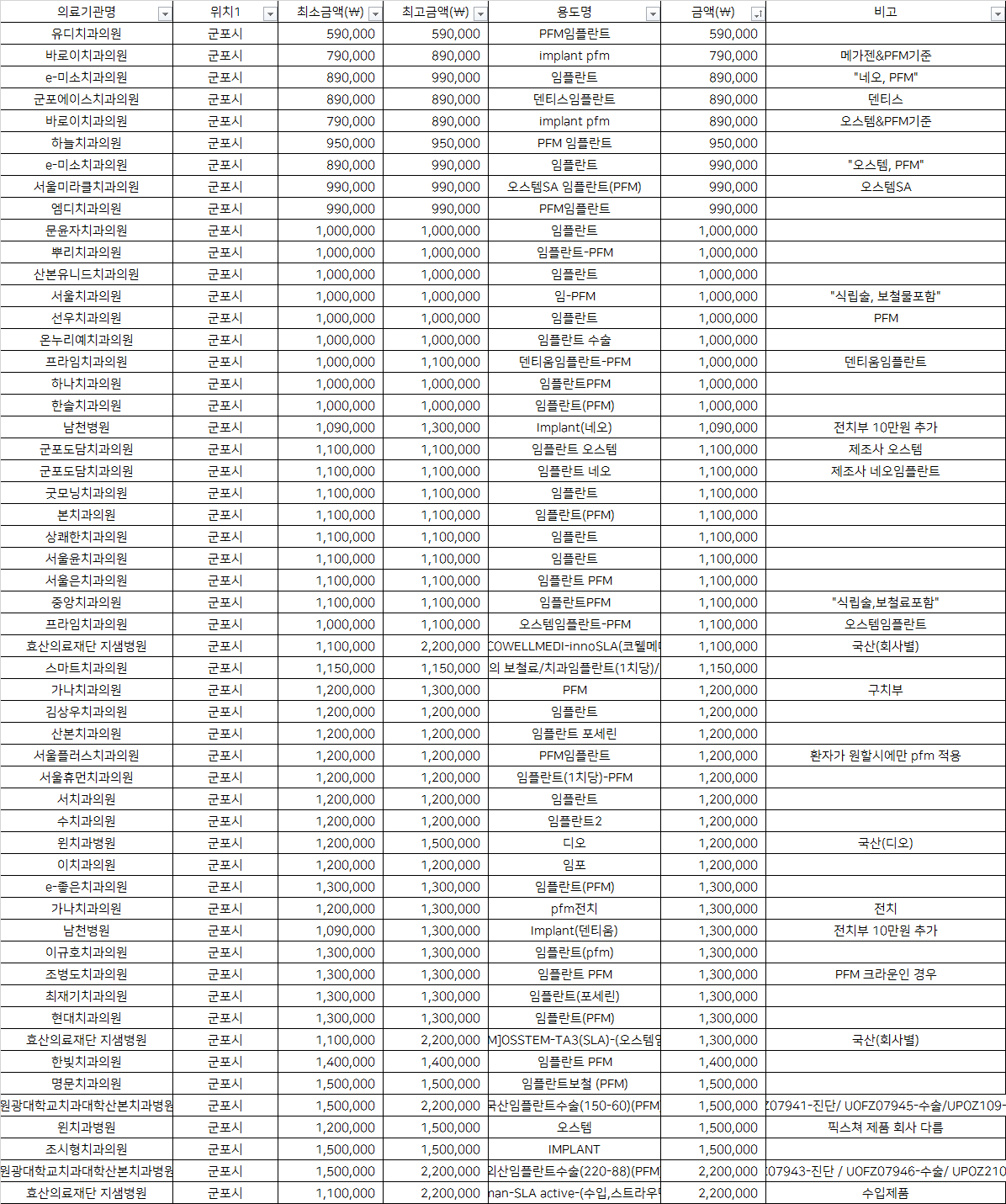 | 군포도담치과의원 | 임플란트 네오 | 1,100,000 | 제조사 네오임플란트 |