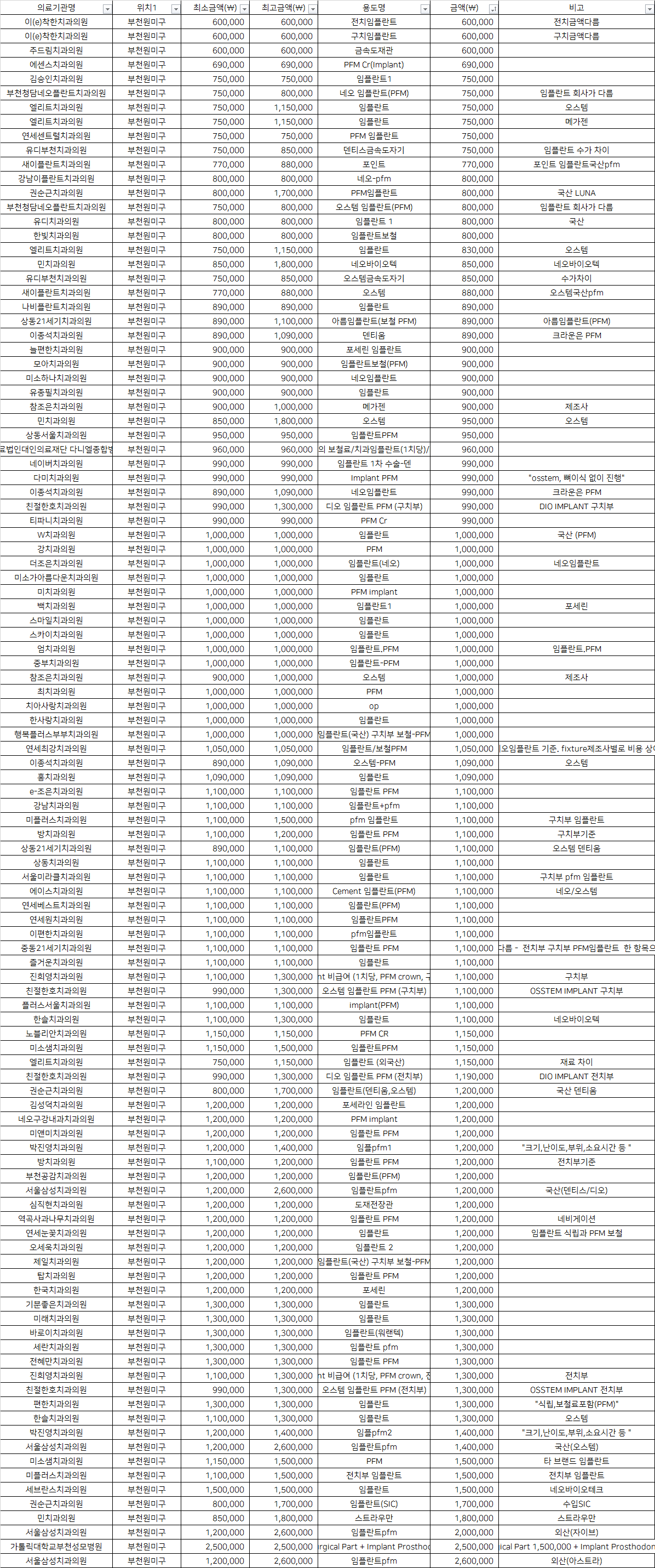| 진희영치과의원 | "Implant 비급여 (1치당, PFM crown, 전치부)" | 1,300,000 | 전치부 |
