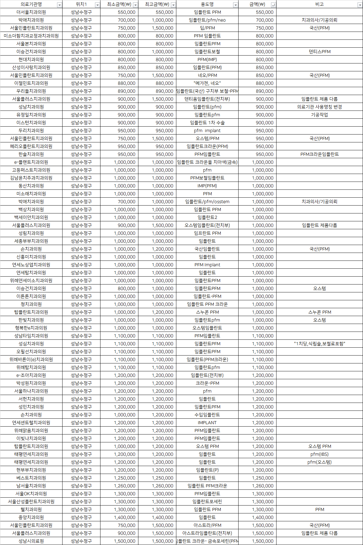 | 성남치과의원 | 임플란트(pfm) | 900,000 | 의료기관 사용명칭 변경 |