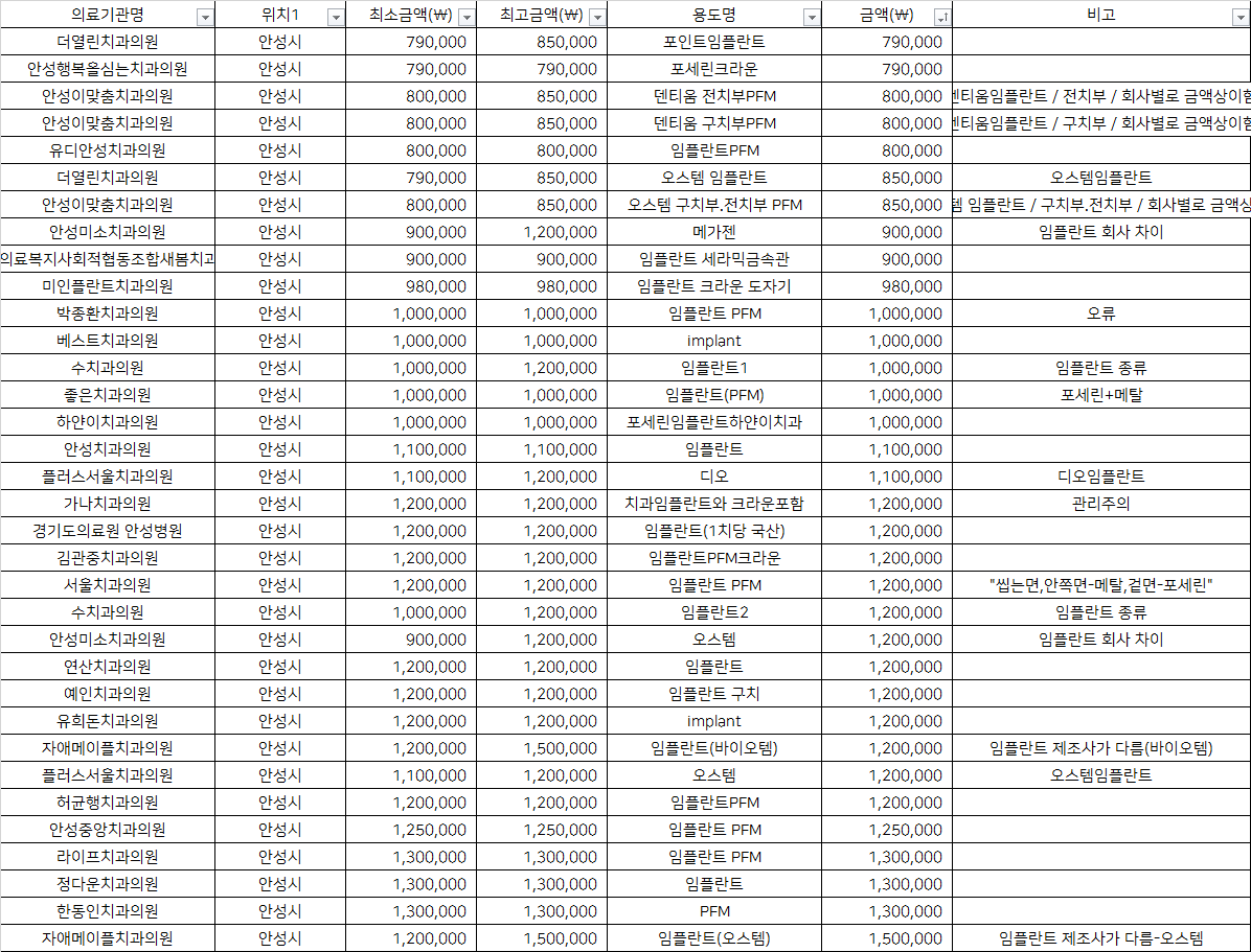 | 안성치과의원 | 임플란트 | 1,100,000 | |