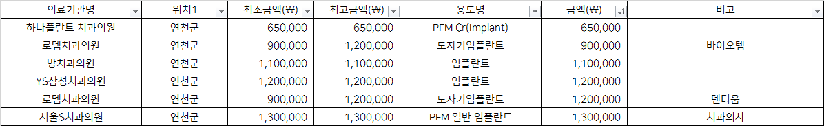 하나플란트 치과의원 PFM Cr(Implant)               650,000