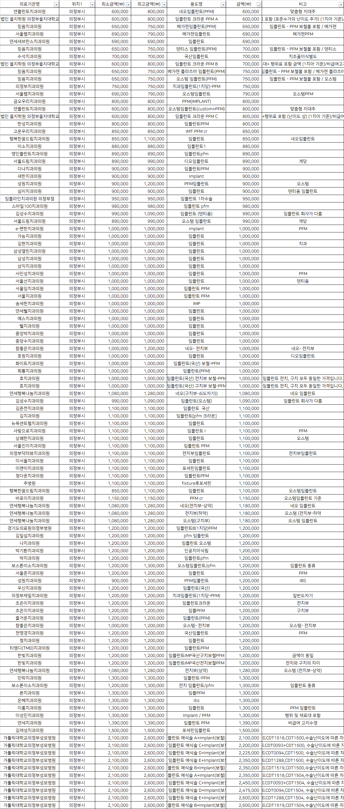 의정부치과의원 치과임플란트(1치당)-PFM               750,000