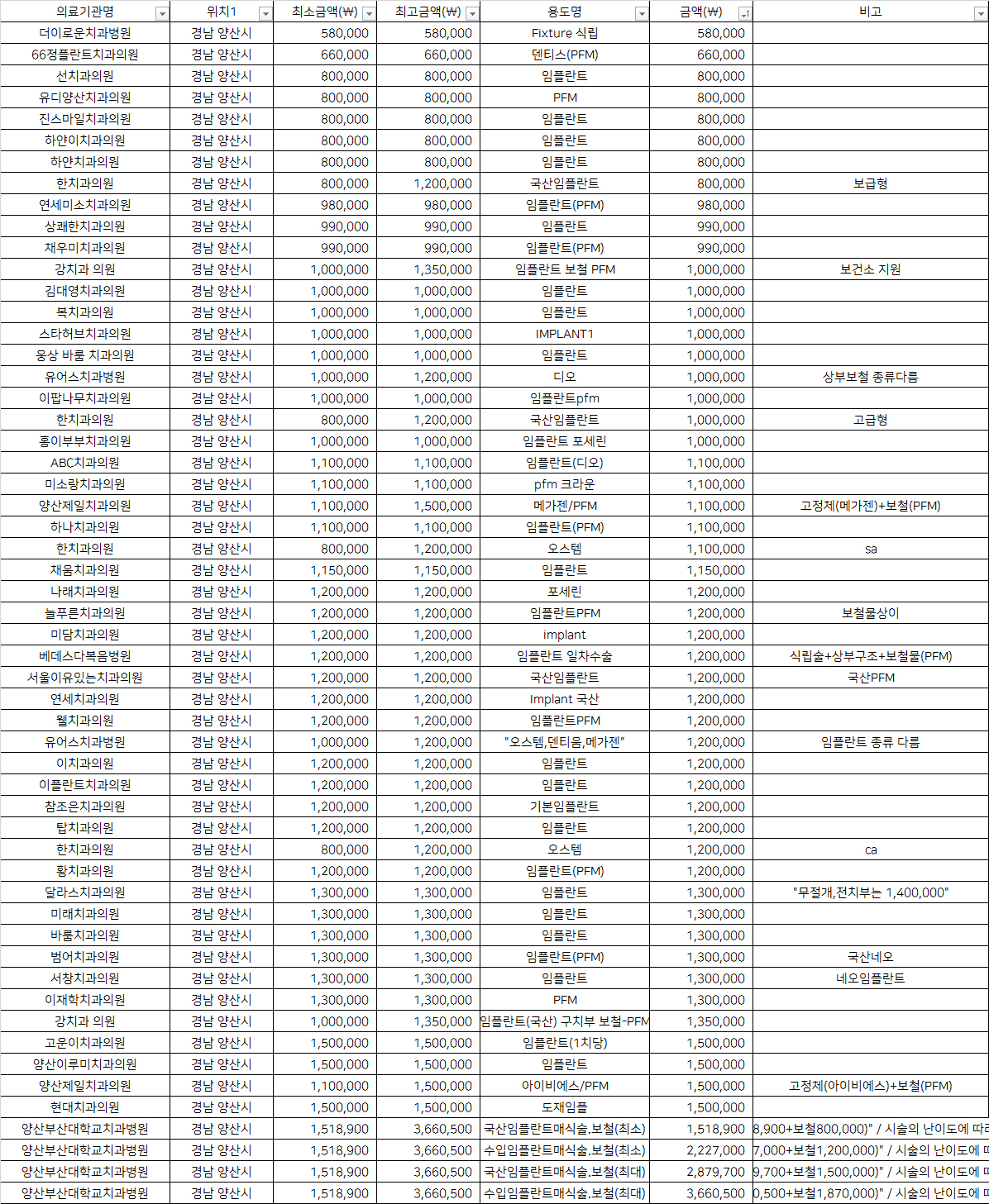 | 양산부산대학교치과병원 | 수입임플란트매식술.보철(최대) | 3,660,500 | "수입(매식1,790,500+보철1,870,000)" / 시술의 난이도에 따라 금액차 발생 |