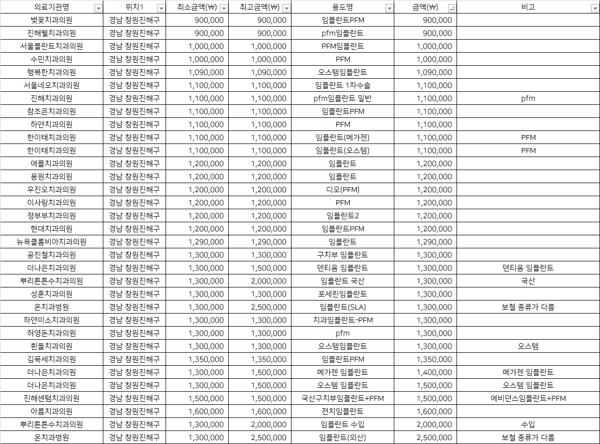 | 진해치과의원 | pfm임플란트 일반 | 1,100,000 | pfm |