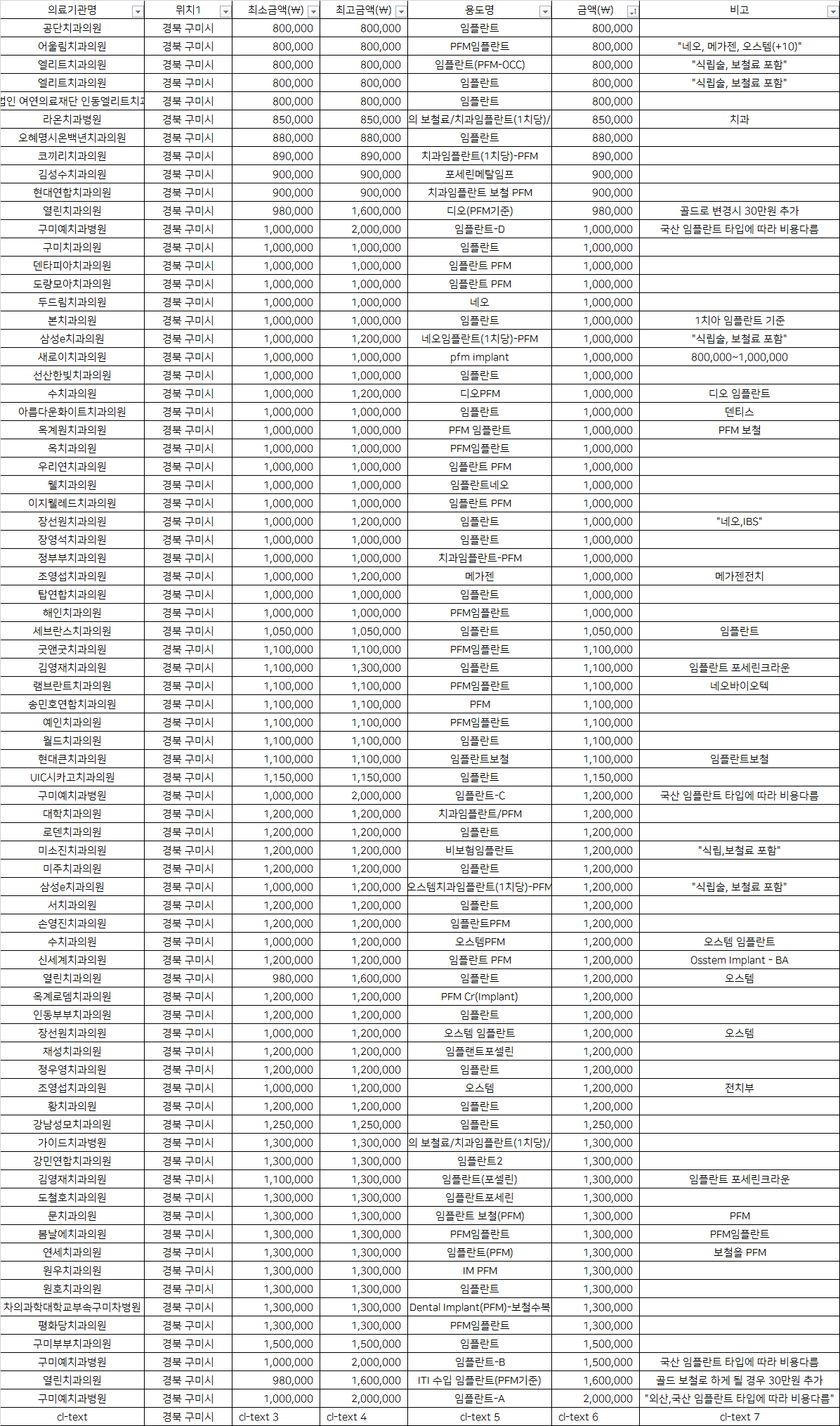 | 어울림치과의원 | PFM임플란트 | 800,000 | "네오, 메가젠, 오스템(+10)" |