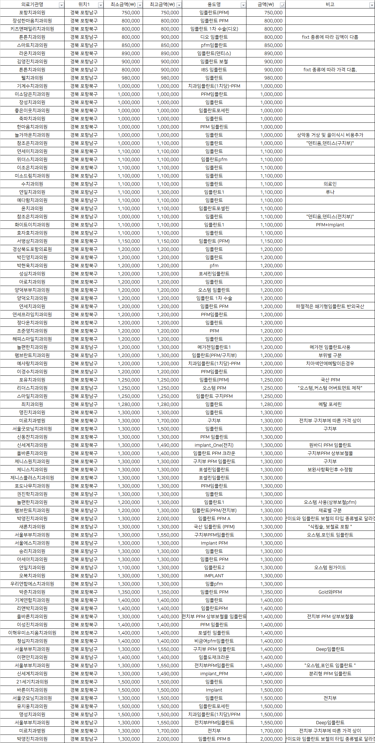 | 포항치과의원 | 남구 | 임플란트(PFM) | 750,000 | |
