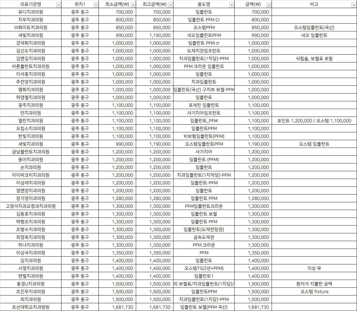| 광주치과의원 | 포세린 임플란트 | 1,100,000 | |