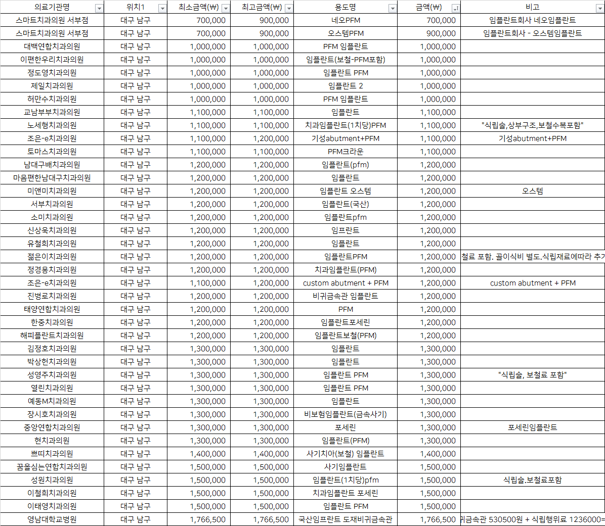 | 영남대학교병원 | 국산임프란트 도재비귀금속관 | 1,766,500 | "국산 도재비귀금속관 530500원 + 식립행위료 1236000=1766500원" |