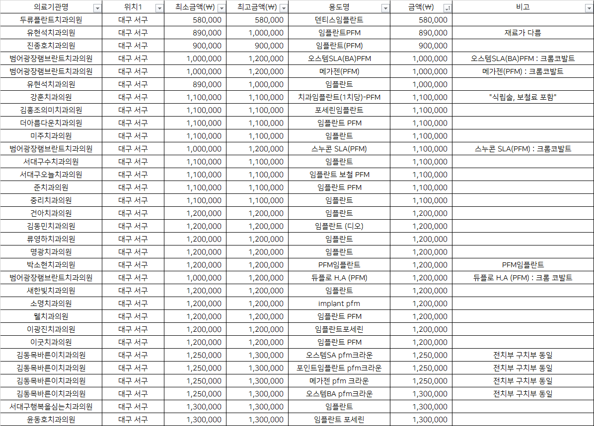 | 서대구수치과의원 | 임플란트 | 1,100,000 | |