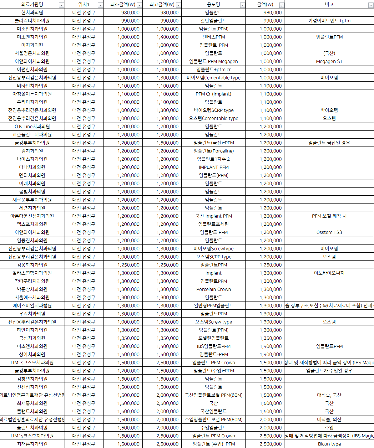 대전광역시 유성구 건강보험 PFM 임플란트 치과 비용 top5 현 클라리티 미소안