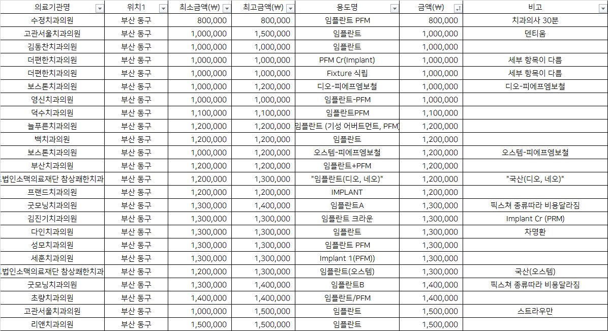 | 의료법인소맥의료재단 참상쾌한치과병원 | "임플란트(디오, 네오)" | 1,200,000 | "국산(디오, 네오)" |