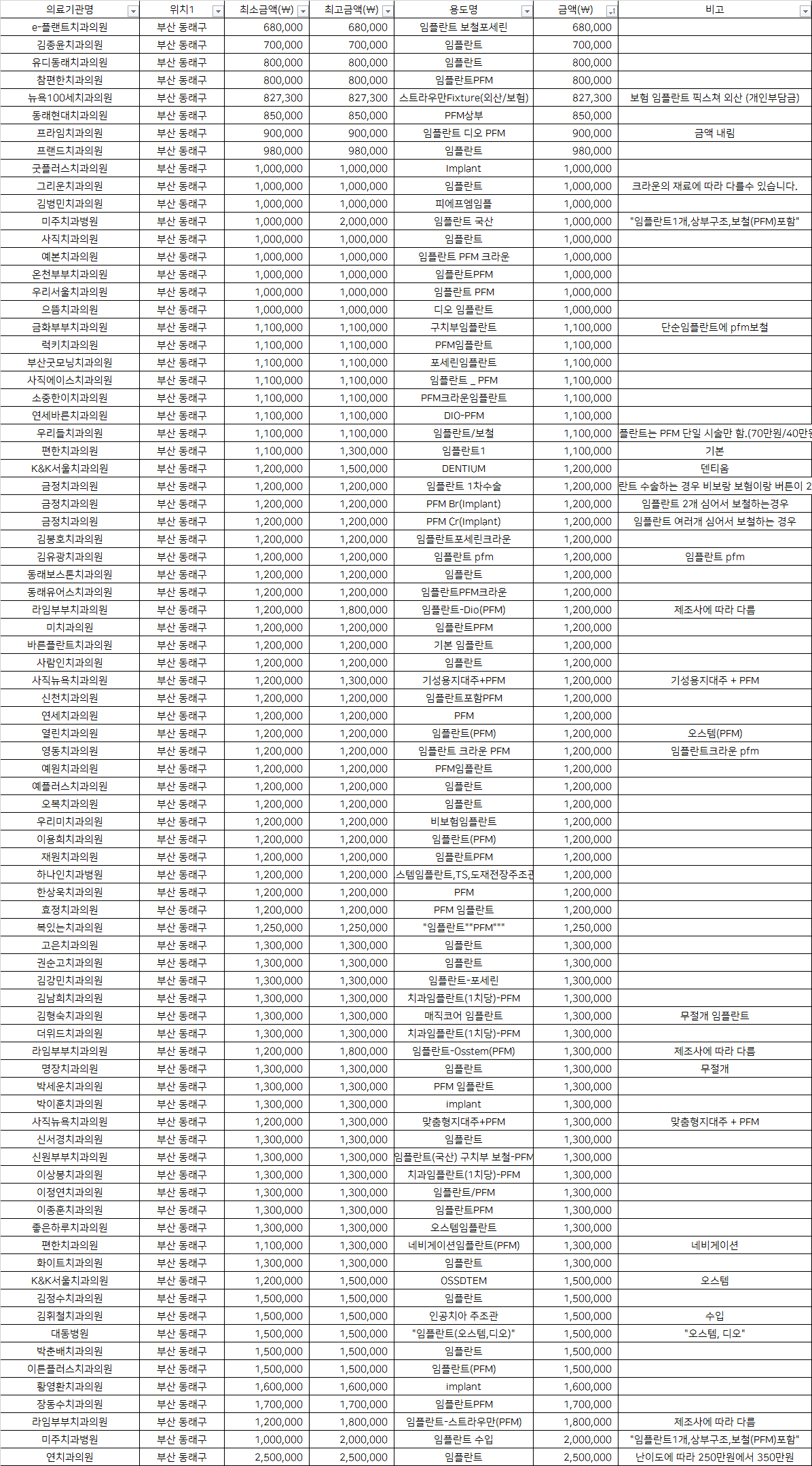 대동병원 "임플란트(오스템,디오)"           1,500,000 "오스템, 디오"