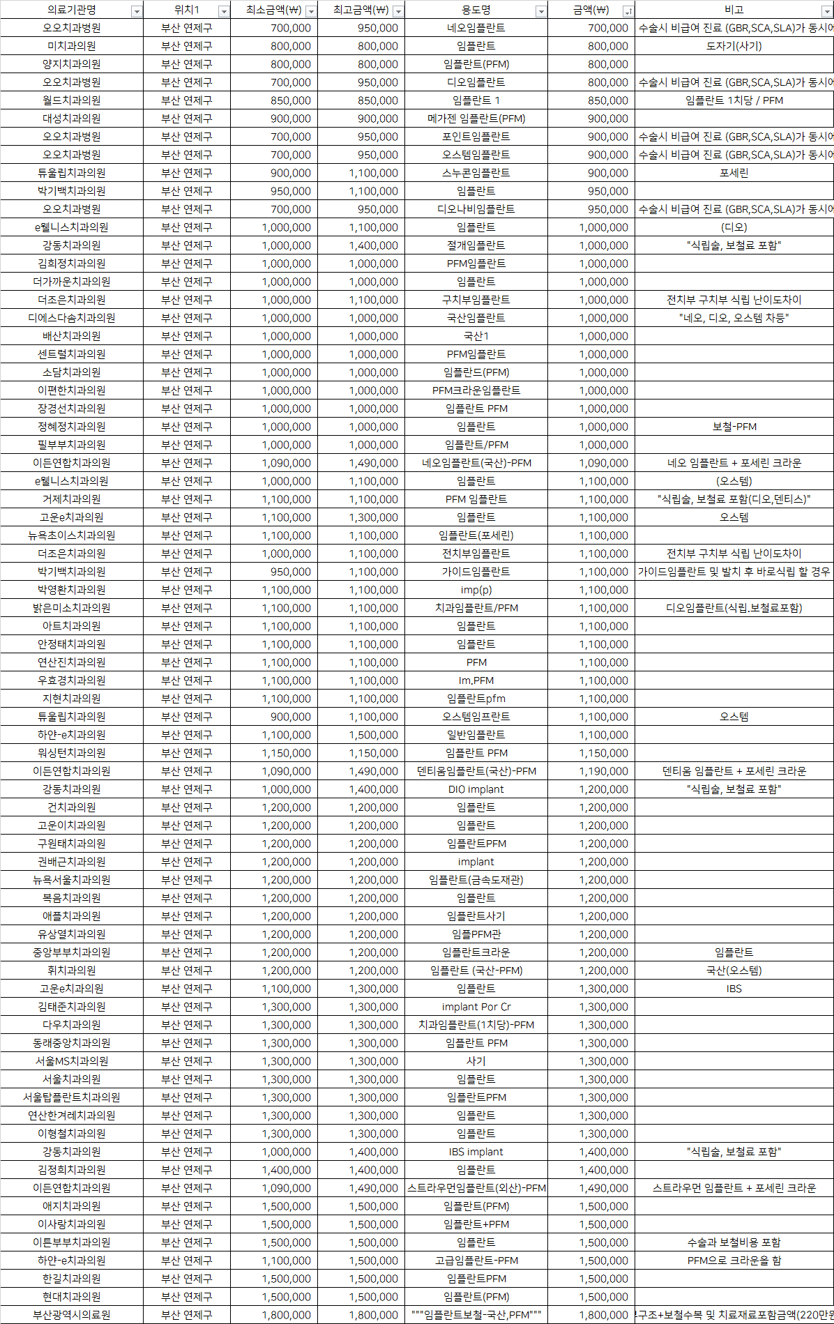 | 부산광역시의료원 | """임플란트보철-국산,PFM""" | 1,800,000 | 식립술+상부구조+보철수복 및 치료재료포함금액(220만원~240만원) |