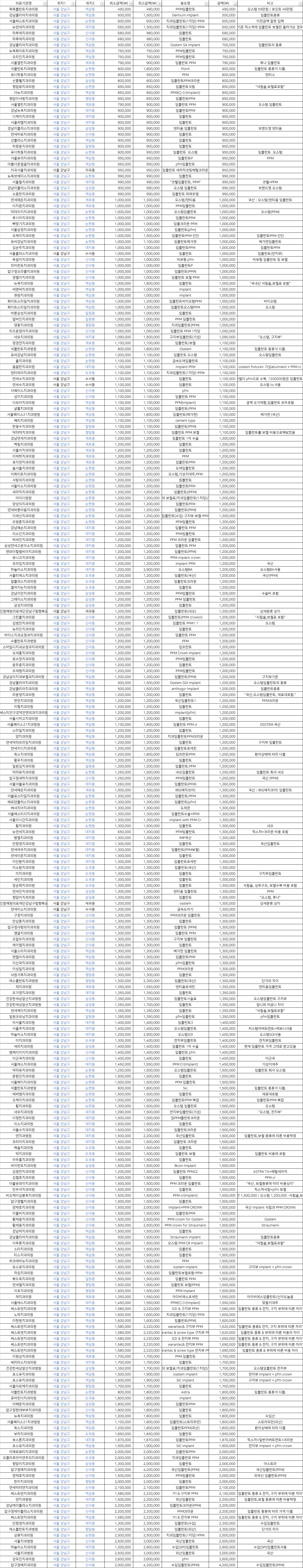 | 서울퍼스트치과의원 | 논현동 | 치과임플란트(1치당)-PFM | 600,000 | 이전금액 잘못 입력 |