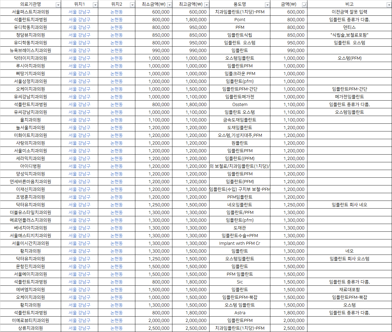 | 황치과의원 | 오스템 임플란트 | 1,500,000 | 오스템 |