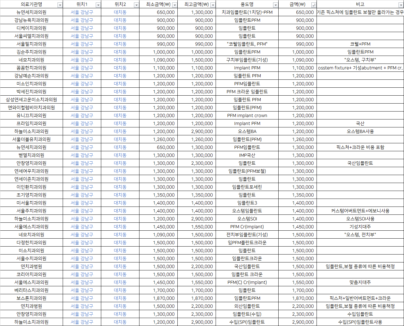 | 꼼꼼한치과의원 | Implant PFM | 1,100,000 | osstem fixture+ 기성abutment + PFM cr. |