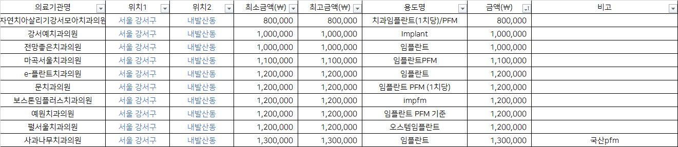 | 마곡서울치과의원 | 임플란트PFM | 1,100,000 | |