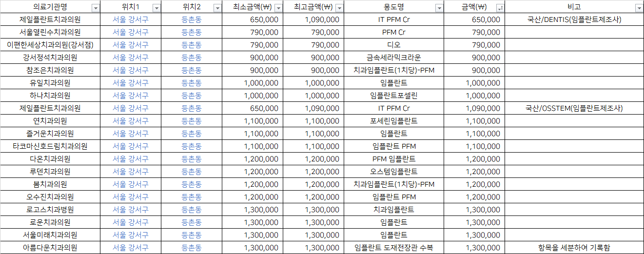 서울특별시 강서구 등촌동 건강보험 PFM 임플란트 치과 비용 top5 제일플란트 서울열린수 이편한세상