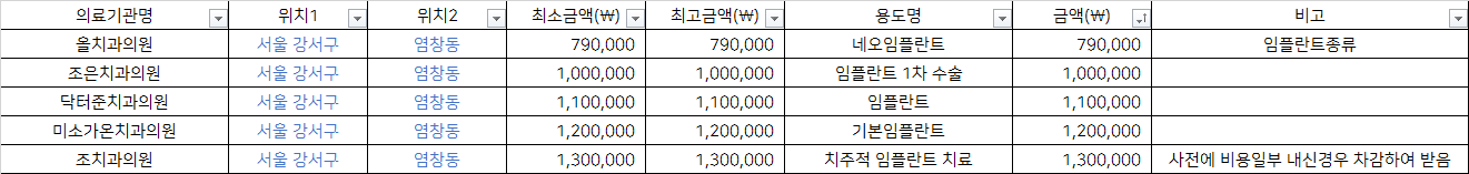 조치과의원 치주적 임플란트 치료           1,300,000 사전에 비용일부 내신경우 차감하여 받음