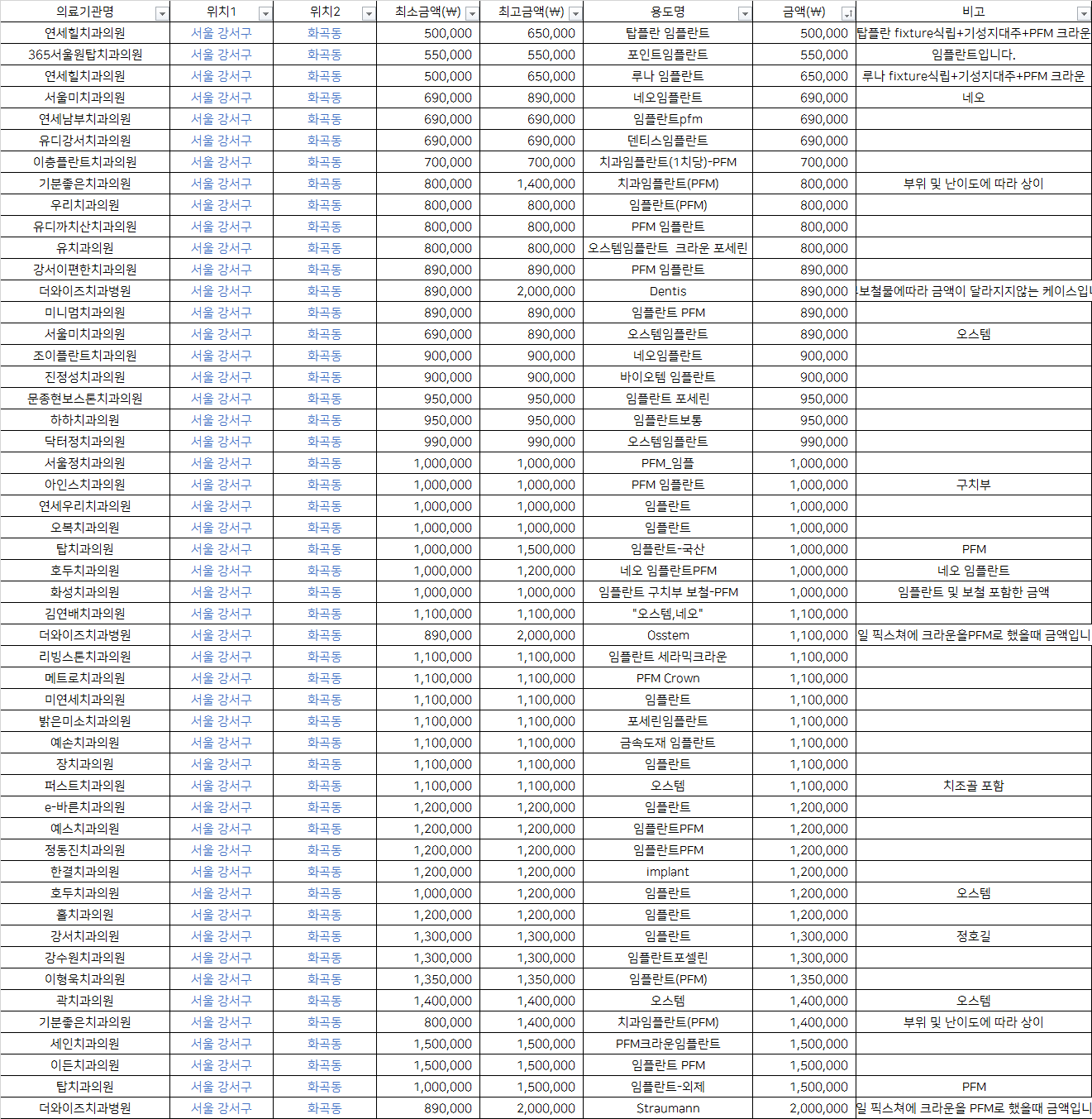 | 강서치과의원 | 임플란트 | 1,300,000 | 정호길 |