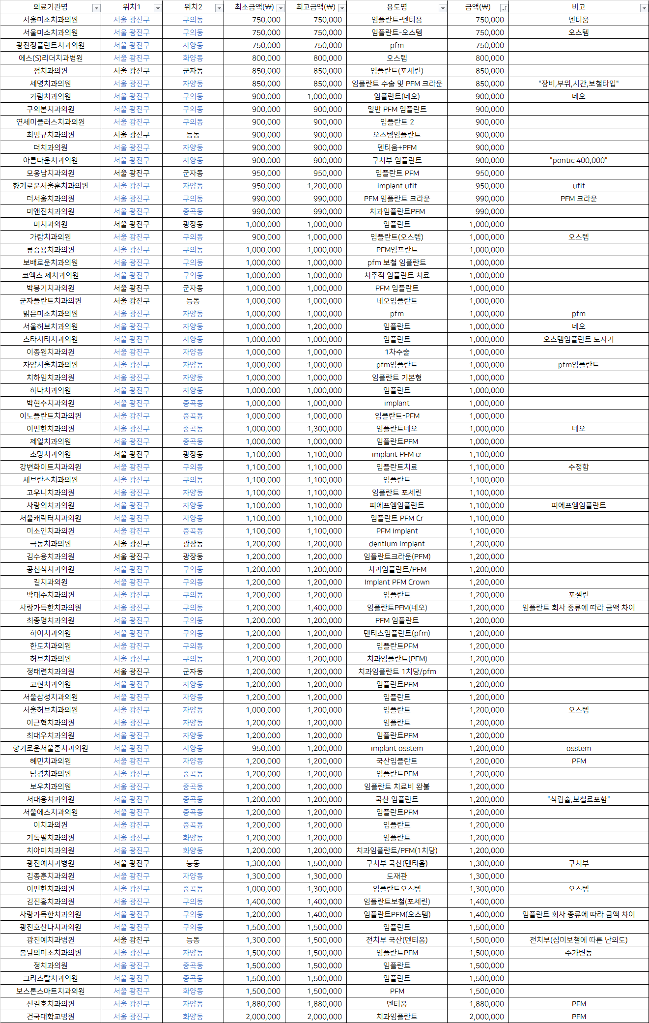 | 서울미소치과의원 | 구의동 | 임플란트-오스템 | 750,000 | 오스템 |