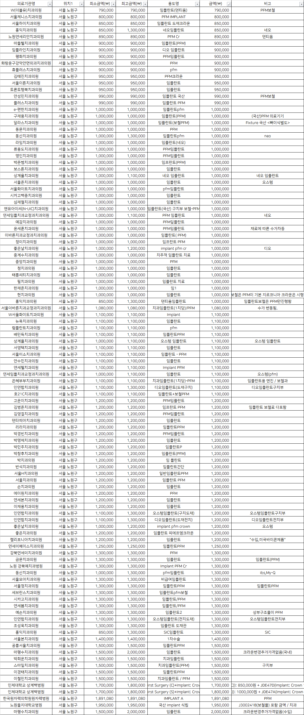 서울특별시 노원구 건강보험 PFM 임플란트 치과 비용 top5 W(더블유) 서울제니스 서울하이