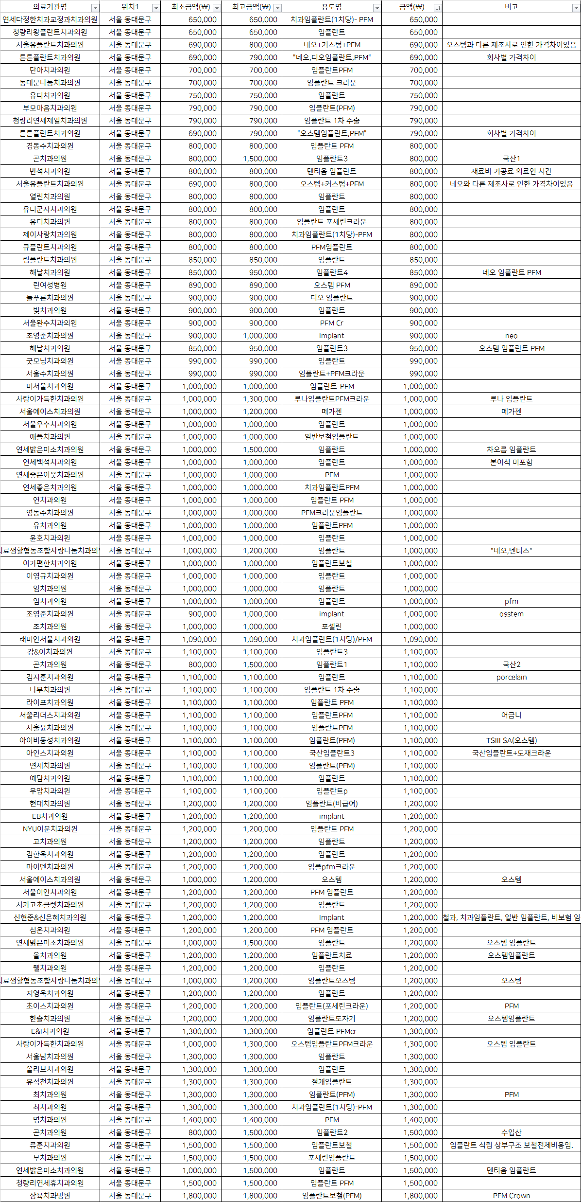 | 서울수치과의원 | 임플란트+PFM크라운 | 990,000 |