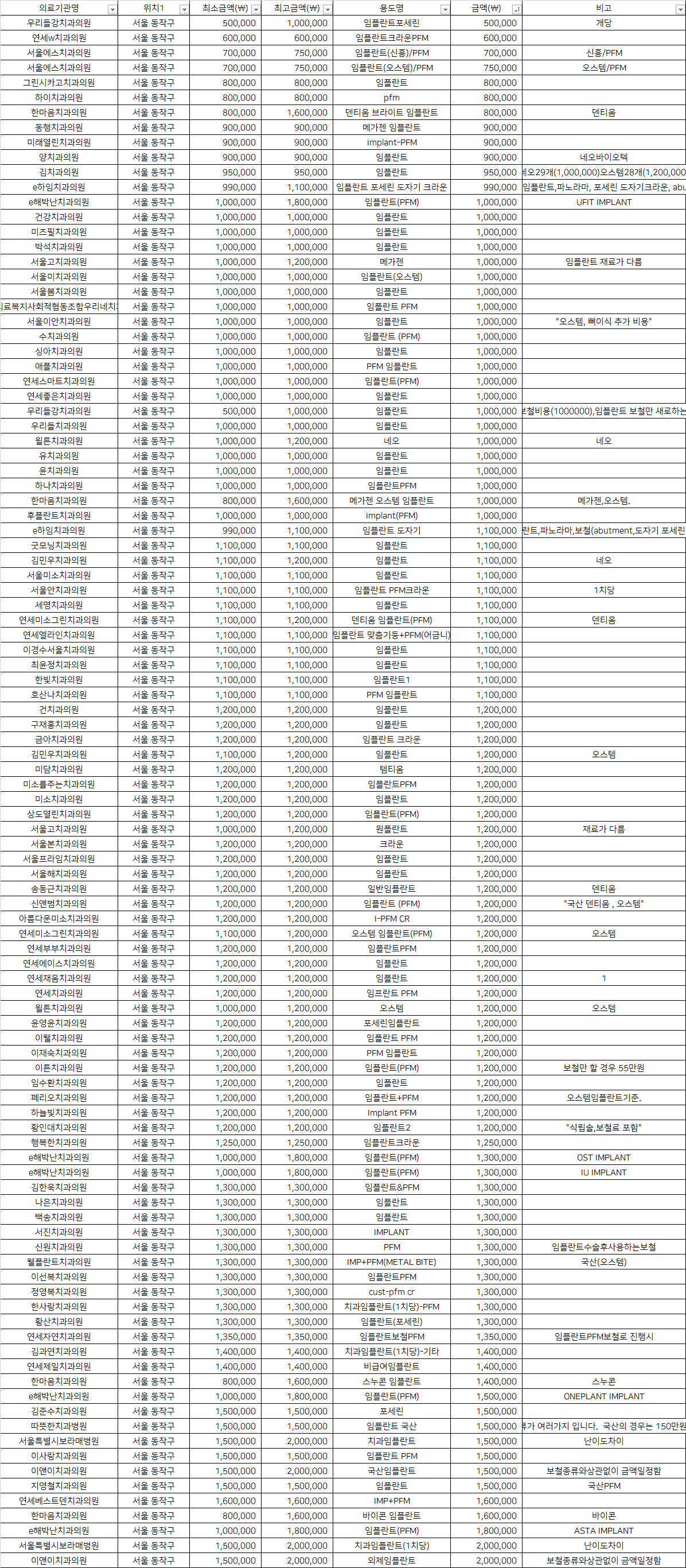김치과의원 임플란트               950,000 "네오29개(1,000,000)오스템28개(1,200,000)"