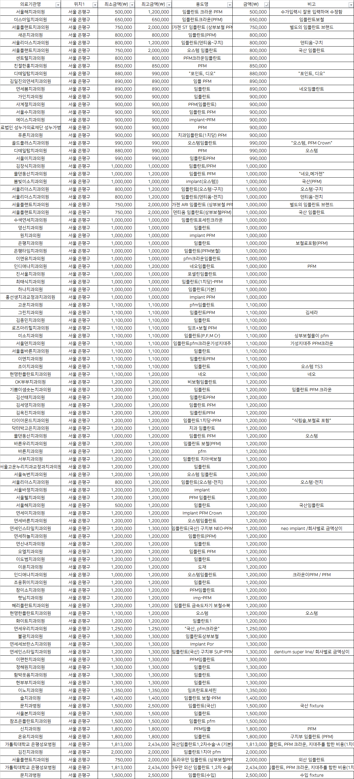 | 서울해치과의원 | 임플란트 크라운 PFM | 500,000 | 수가입력시 잘못 입력하여 수정함 |
