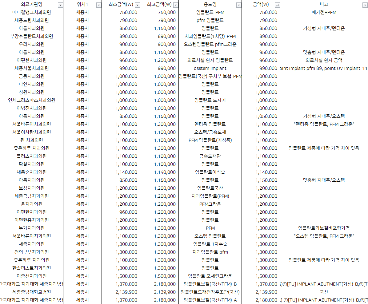 세종특별자치시 건강보험 PFM 임플란트 치과 비용 top5 메디컬뱅크 세종드림 아름