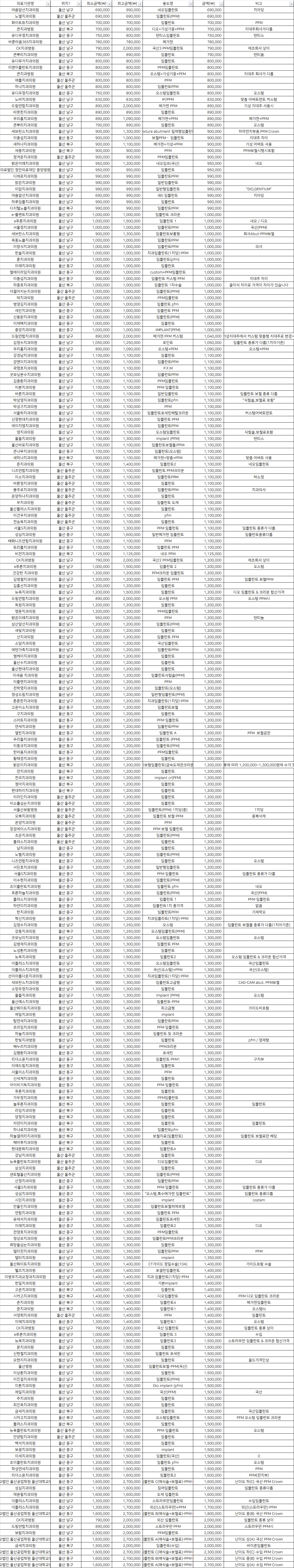 | 디지털노블치과의원 | 울산 북구 | 임플란트PFM | 990,000 |