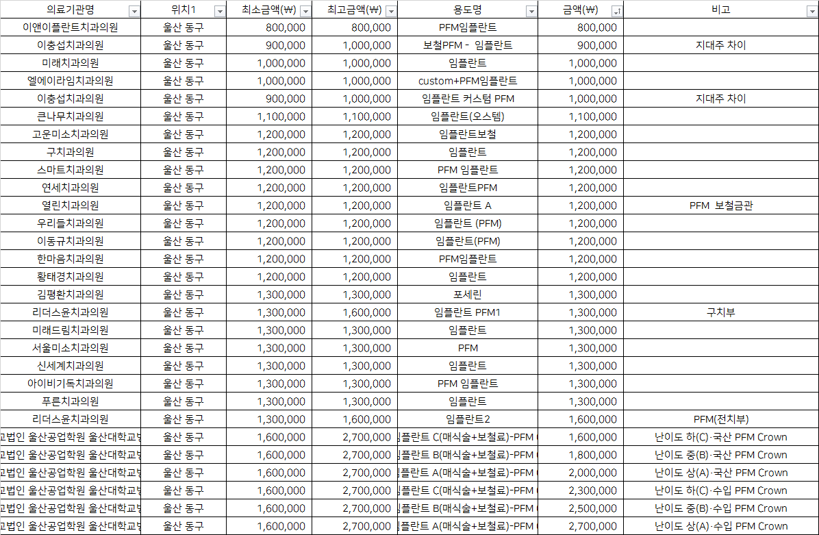 학교법인 울산공업학원 울산대학교병원 국산 임플란트 B(매식술+보철료)-PFM Crown           1,800,000 난이도 중(B)·국산 PFM Crown