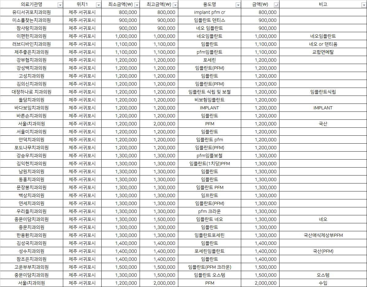 | 중문미담치과의원 | 임플란트 오스템 | 1,500,000 | 오스템 |