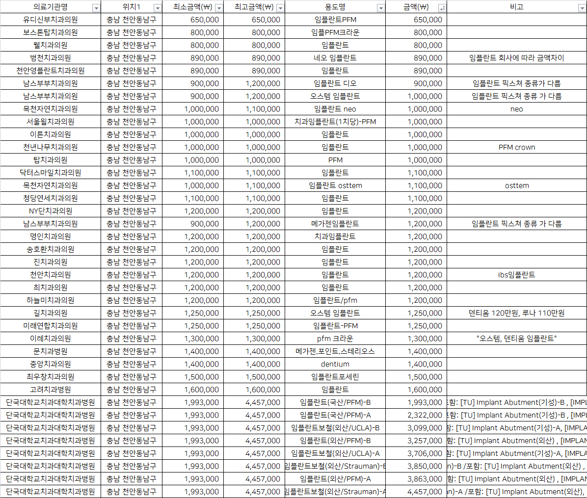 | 병천치과의원 | 네오 임플란트 | 890,000 | 임플란트 회사에 따라 금액차이 |