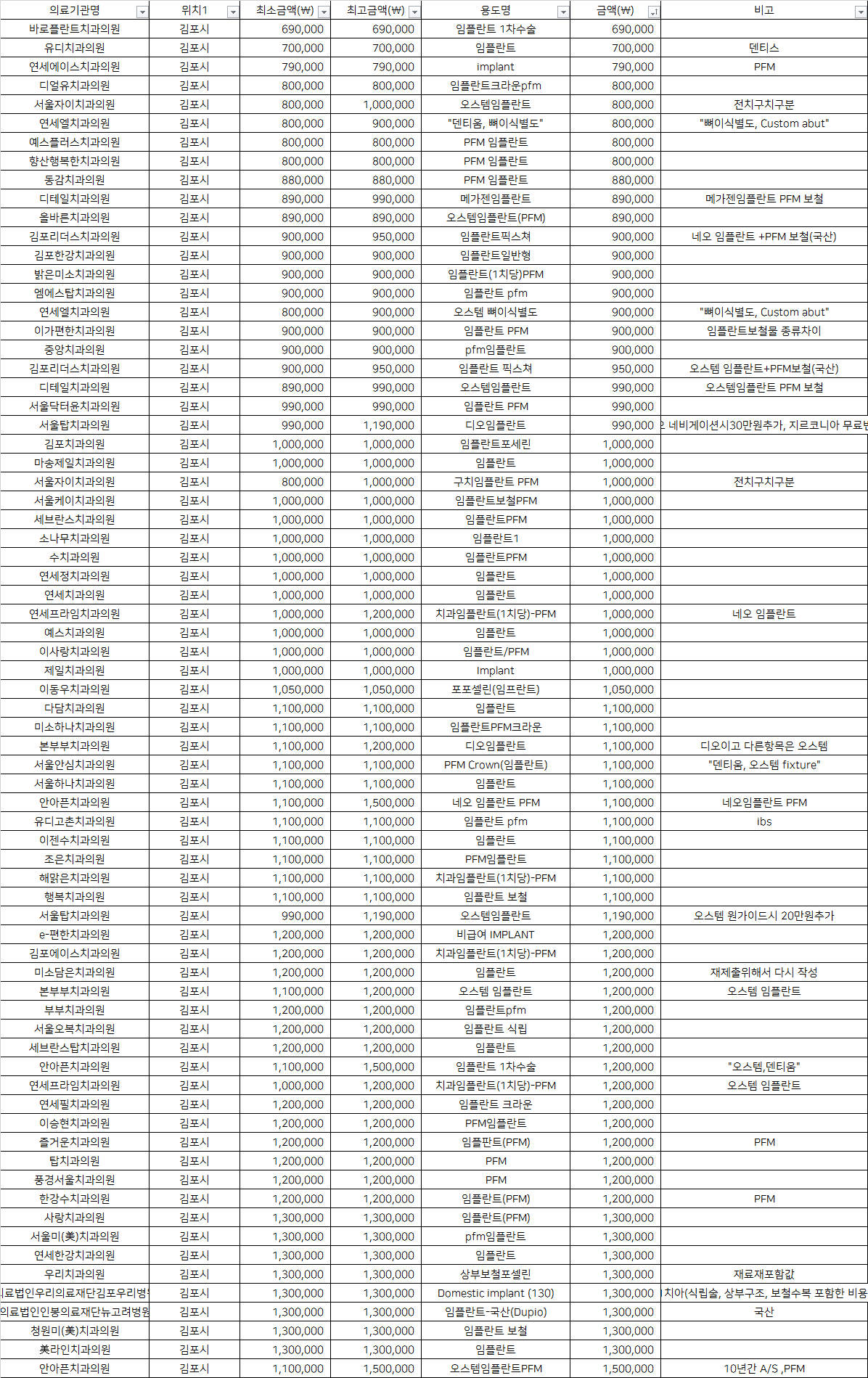 | 김포리더스치과의원 | 임플란트 픽스쳐 | 950,000 | 오스템 임플란트+PFM보철(국산) |