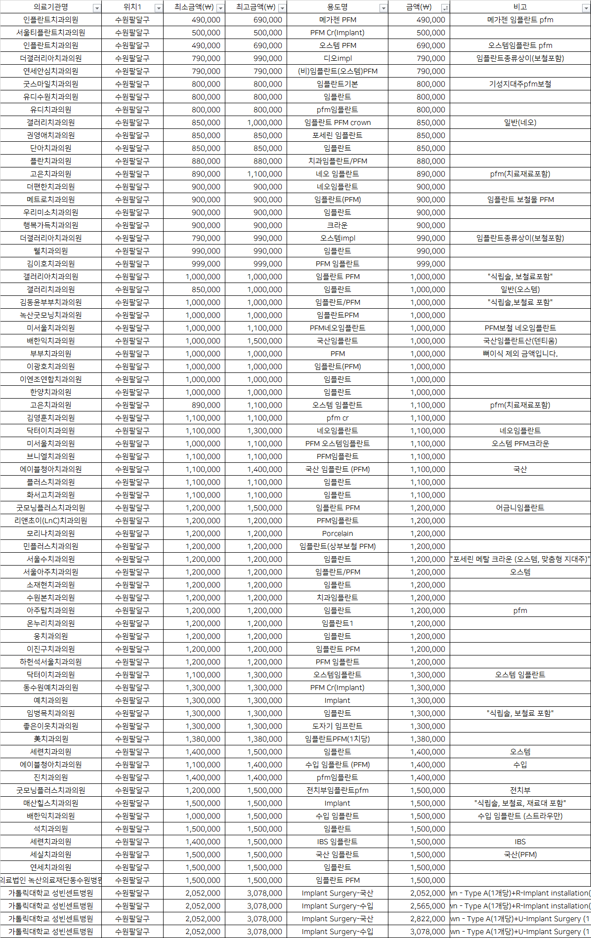 | 동수원예치과의원 | PFM Cr(Implant) | 1,300,000 | |
