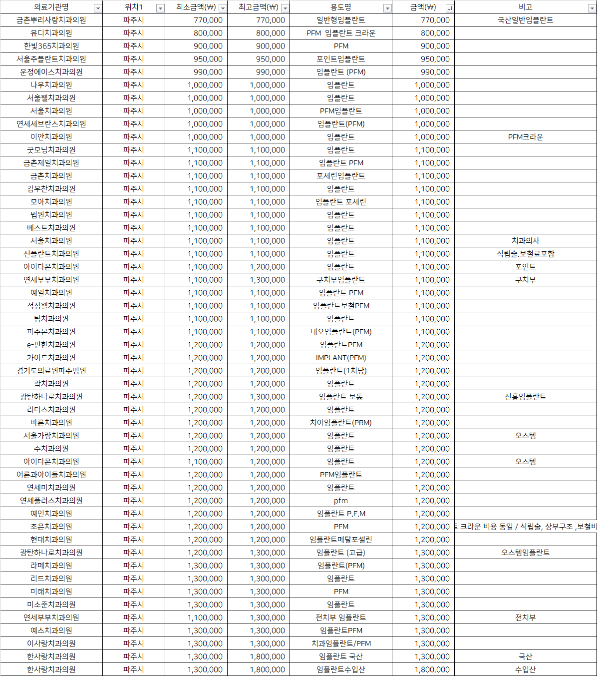 | 파주본치과의원 | 네오임플란트(PFM) | 1,100,000 | |