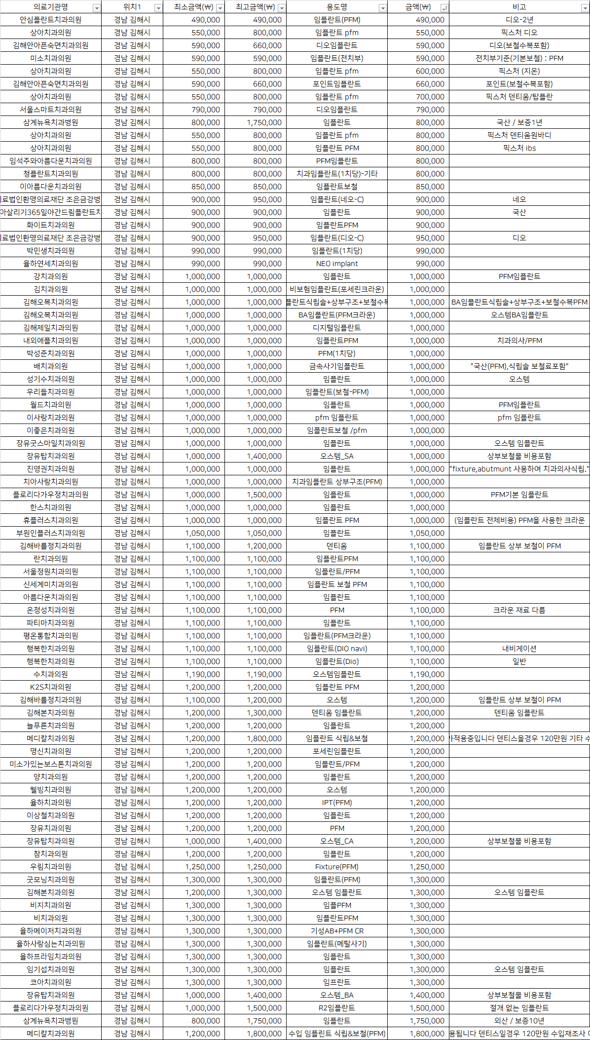 | 장유탑치과의원 | 오스템_CA | 1,200,000 | 상부보철물 비용포함 |