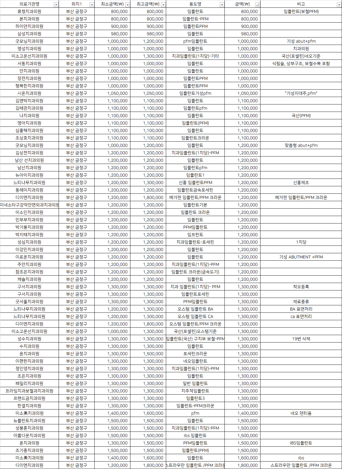 | 구서치과의원 | 치과 임플란트(1치당)- PFM | 1,300,000 | 착오등록 |