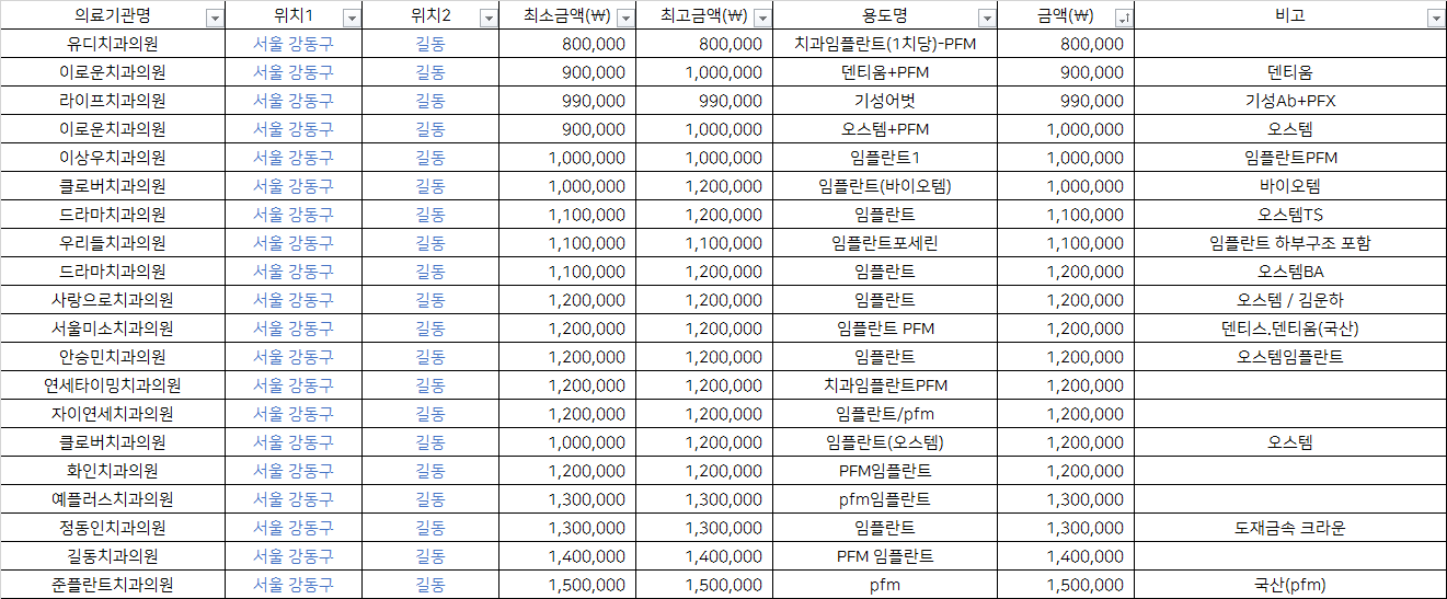 | 길동치과의원 | PFM 임플란트 | 1,400,000 | |