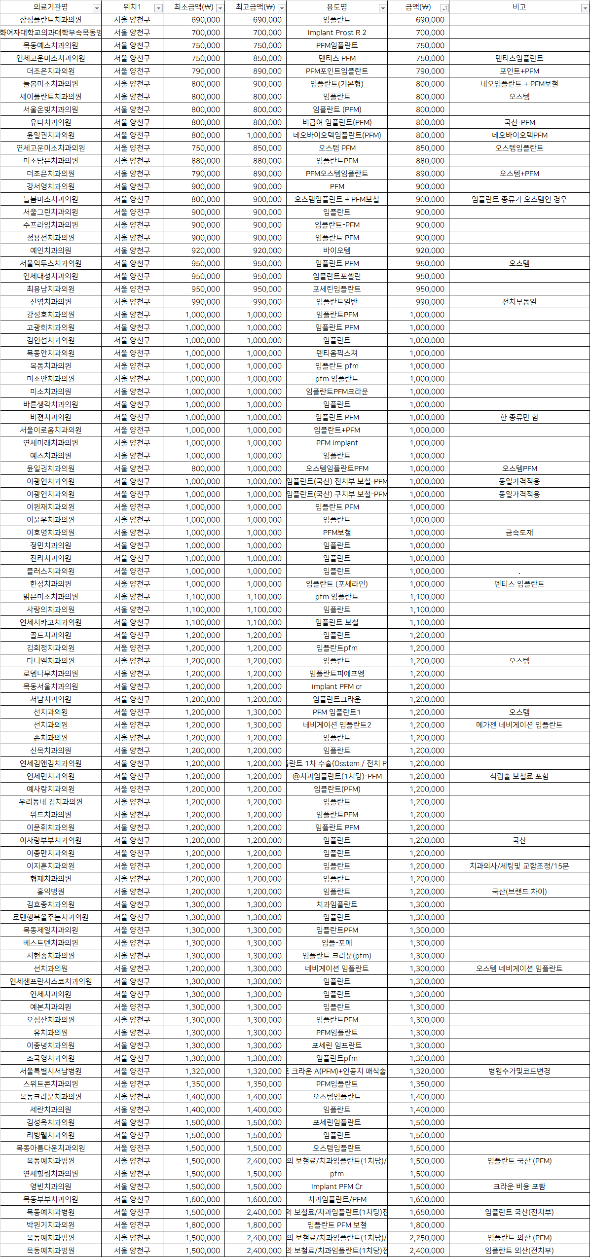 | 서울익투스치과의원 | 임플란트 PFM | 950,000 | 오스템 |