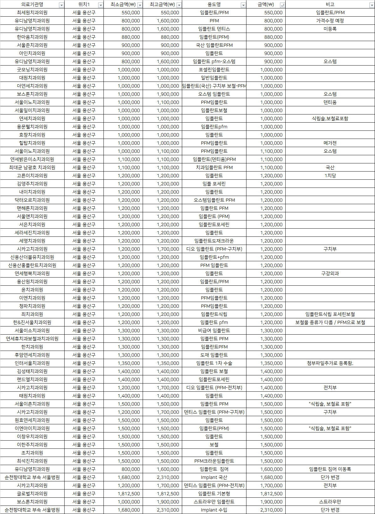 | 최세원치과의원 | 임플란트/PFM | 550,000 | 임플란트/PFM |