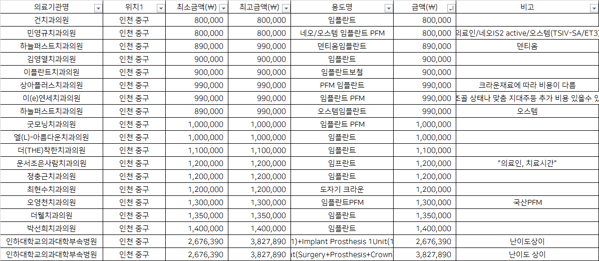 | 운서조은사람치과의원 | 임프란트 | 1,200,000 | "의료인, 치료시간" |